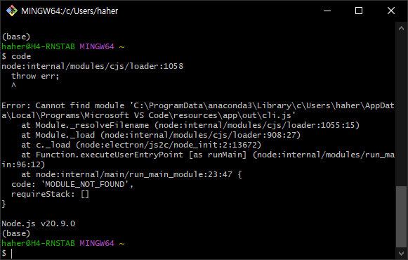 Type: Bug Running Git bash in Windows Terminal, (base) conda environment is active. Command code . returns the following error: node:internal/modules/cjs/loader:1013 throw err; ^ Error: Cannot find...